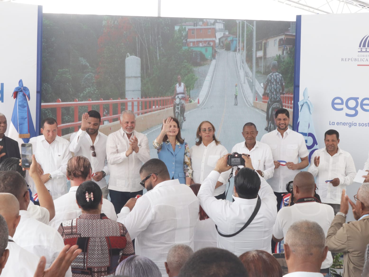La vicepresidenta de la República, Raquel Peña, encabezó el acto de inauguración del puente sobre el arroyo Los Calimetes, en el municipio de Los Cacaos, provincia de San Cristóbal, construido por la Empresa de Generación Hidroeléctrica Dominicana (EGEHID).