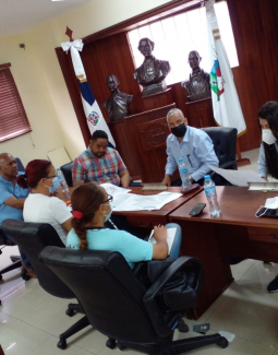 En sesión de trabajo participaron Miguel Renato por el INTRANT; Elvin Sánchez y Emilia Pereyra por el Ayuntamiento Municipal de San Cristóbal (AMSC).